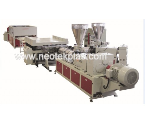 The advantage of WPC co-extruded foaming board extrusion line is that it can greatly reduce the equipment cost and formula cost (compared with the real skin foaming equipment), the product quality and all aspects of the parameters are close to or better than the real skin foaming board (1.22m product width, 5~20mm thick, density ~0.5g/cm3, surface strength: 50~75 Rockwell hardness), and the surface of the products can be hot stamping, printing or film, to obtain different patterns and patterns, in addition to some need to fold the application occasions, after hot bending treatment can meet the application requirements.