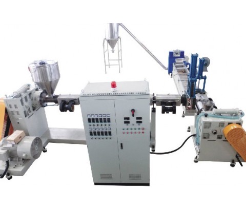 由兩臺單螺桿擠出機、液壓換網(wǎng)器、拉條造粒模具、水槽冷卻裝置、吹干裝置、切粒裝置、風(fēng)送儲存系統(tǒng)組成。