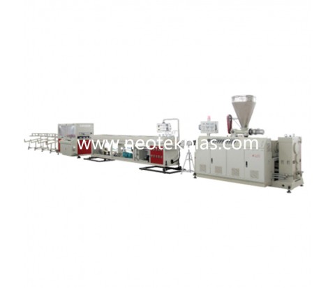生產(chǎn)線由錐形雙螺桿擠出機(jī)、真空定徑箱,牽引切割機(jī)、堆放架組成,配以不同規(guī)格模具,生產(chǎn)4出16-32電工穿線管材,大大提高了生產(chǎn)效率。